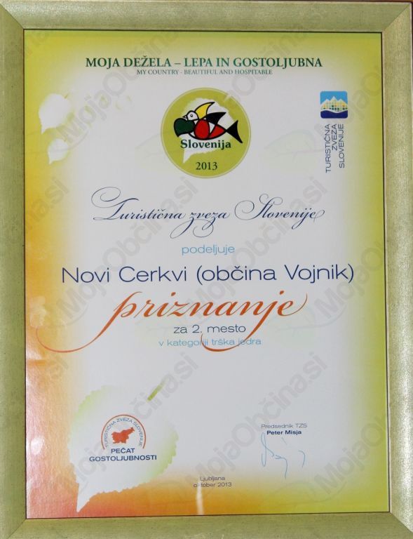Priznanje Turističnemu društvu Nova Cerkev iz rok Turistične zveze Slovenije sta v Podčetrtku prevzela naš župan Beno Podergajs in predsednica TD Zvezdana Stolec. Na seji odbora za gospodarstvo in turizem so ga prevzeli lastniki, člani Turističnega društva Nova Cerkev. Povedanih je bilo veliko lepih in vzpodbudnih besed o preteklem delu TD, izraženih je bilo veliko želja, da nadaljujemo s svojim delom. Člani društva se zavedamo, da osvojeno drugo mesto v projektu Slovenija moja dežela – lepa in gostoljubna pomeni zahvalo vsakemu izmed vas, ki skrbite za svoje okolje, urejujete vaške gredice, pometate vas, zalivate rože in ste prijazni do obiskovalcev in sokrajanov. Iskrene čestitke, Nova Cerkev!