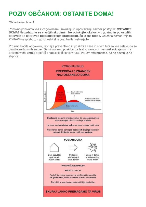 Ponovno pozivamo vse k odgovornemu ravnanju in upoštevanju navodil pristojnih: OSTANITE DOMA! Ne zadržujte se v večjih skupinah! Ne obiskujte lokalov, v trgovino in po ostalih opravkih se odpravite po preudarnem premisleku, če je res nujno. Ostanite doma! Pojdite ZDRAVI na sprehod, v gozd, nabirat regrat, berite, ustvarjajte ...