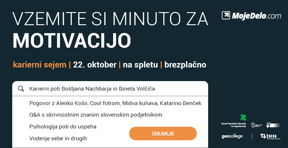 »Časi so negotovi, zato je to morda najbolj pravi trenutek, da naredimo nekaj zase, izboljšamo svoja znanja in tako poskrbimo za boljšo prihodnost. Pa naj bo to v obliki predavanj o aktualnih trendih, kot so digitalni odtis v času koronavirusa in umetna inteligenca 4.0, v obliki iskanja navdihujoče karierne poti pri znanih obrazih, kot sta Boštjan Nachbar in Bine Volčič, ali uspešnih vplivnežih, kot so Alenka Košir, Cool Fotr in drugi, v obliki osvojenega praktičnega znanja ali spoznavanja delodajalcev, ki iščejo nove sodelavce, prijave na delovno mesto s spletnim razgovorom za delo. Za vsakogar se bo našlo kaj, ne glede na to, ali si boste vzeli eno uro ali cel dan,« so povedali pri MojeDelo.com.