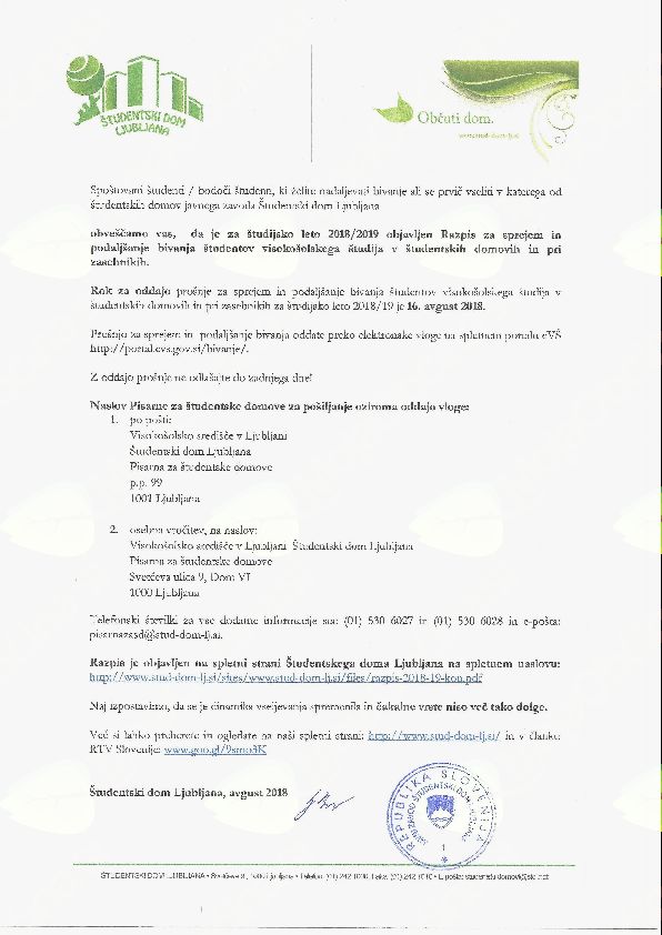 V priponki vam posredujem obvestilo o razpisu za subvencionirano bivanje za študente.