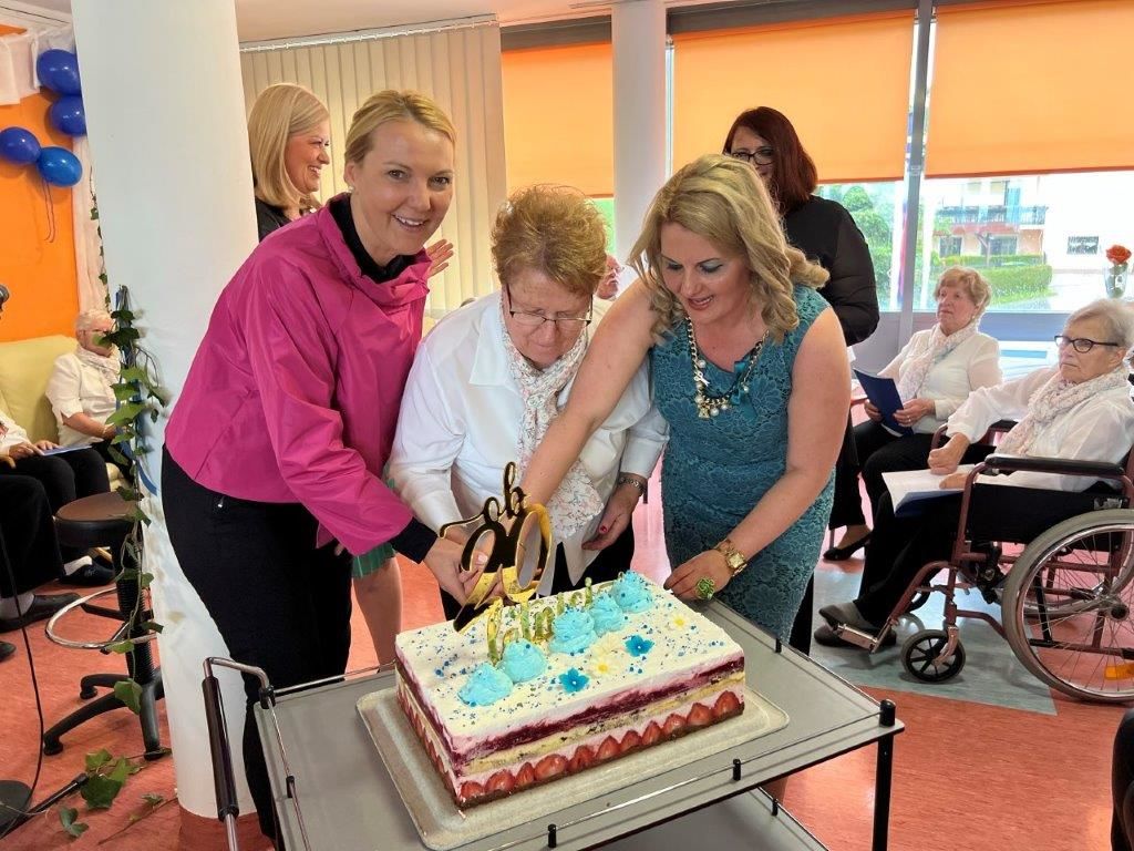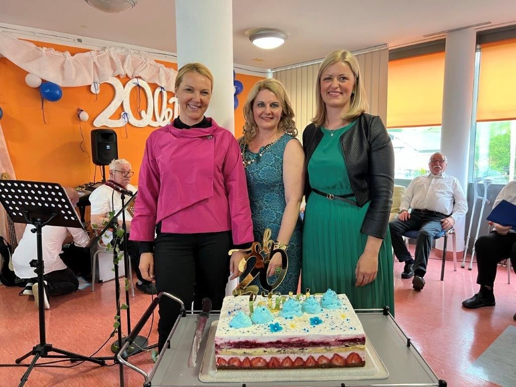 Direktorica Nina Mažgon in direktorica zdravstvene nege Barbara Brečko sta podelili priznanje stanovalcu Silvestru Koširju, ki najdlje biva v našem domu, in sicer je z nami od maja 2003. Ob 20-letnici doma sta se za požrtvovalno delo zahvalili vsem sodelavkam in sodelavcem. Priznanje je prejelo tudi 12 zaposlenih, ki so v domu zaposleni od leta 2003. Na rojstnodnevnem slavju ne sme manjkati torta. Prvi kos so skupaj odrezale: stanovalka, ki biva v domu od leta 2005, Jožica Mirnik, direktorica doma in poslovna direktorica SeneCure Slovenija. Zabavo smo nadaljevali ob dobrotah, ki so jih za nas pripravili v domski kuhinji. Vsi obiskovalci so prejeli tudi darilo, izdelke, ki so jih izdelali stanovalci na ustvarjalni delavnici, in piškote, ki so jih spekli stanovalci na kulinaričnih uricah. Bilo je lepo, bilo je zabavno in bilo je čustveno, kot se za okroglih 20 let spodobi.
