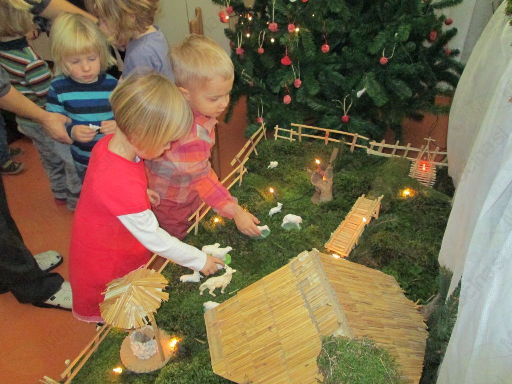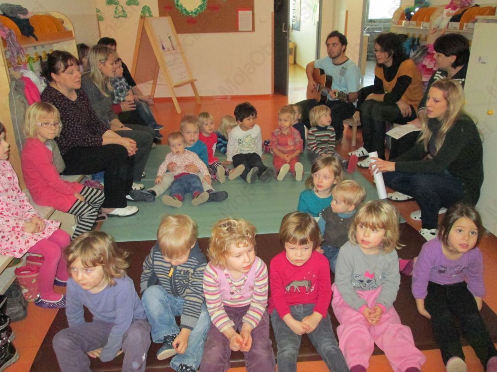 Ob skupnem druženju smo skozi pripoved in pesem Poslušajte vsi ljudje spoznali božično zgodbo. Otroci so sami postavili figurice v hlevček in ovčke okoli njega. Medtem pa so odmevale še druge božične pesmi.