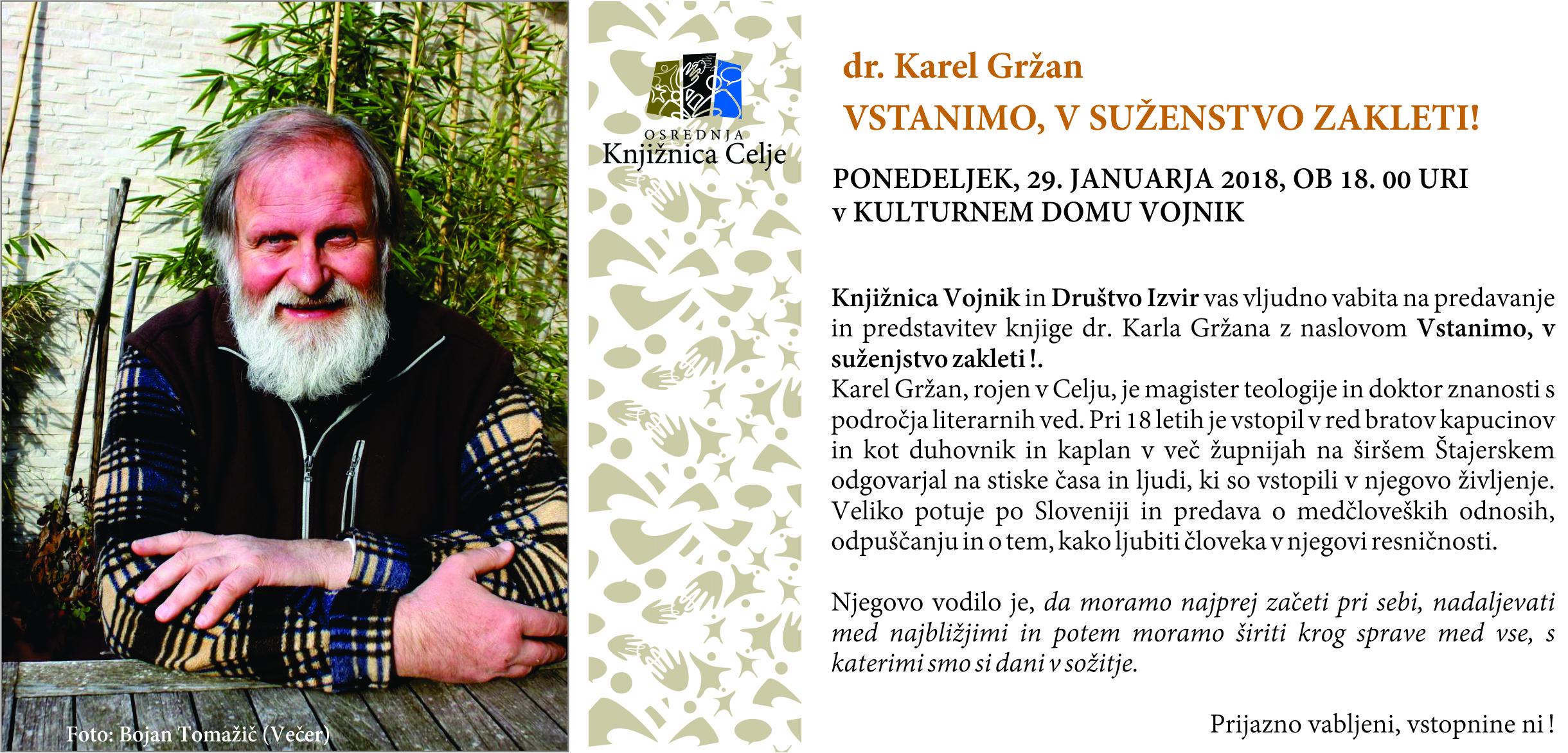 V ponedeljek, 29. januarja 2018, ob 18. uri vas v Kulturni dom Vojnik vljudno vabita Knjižnica Vojnik in društvo Izvir na predavanje in predstavitev knjige dr. Karla Gržana z naslovom Vstanimo, v suženjstvo zakleti!