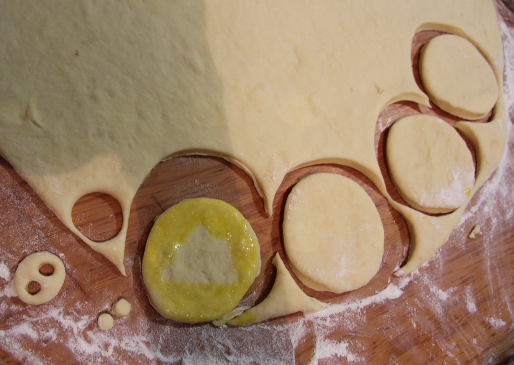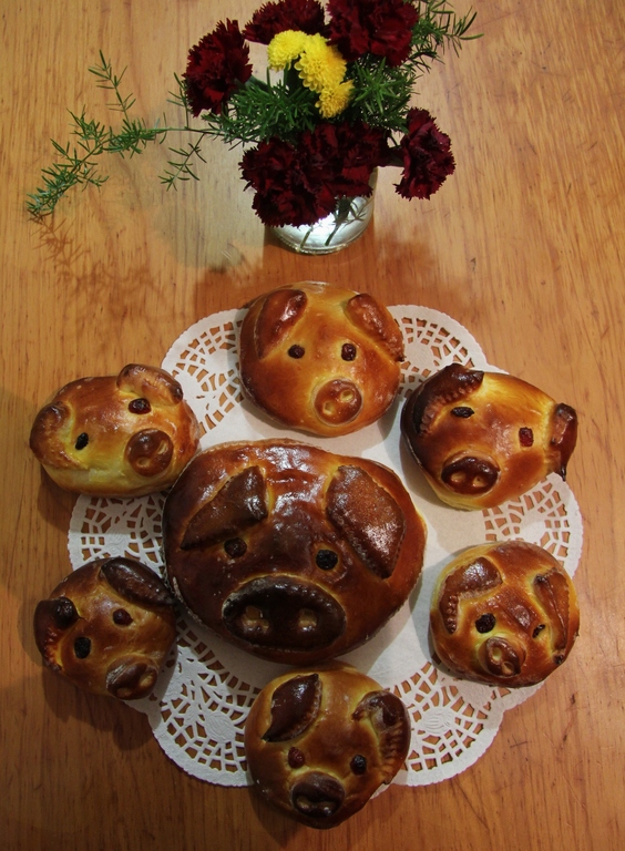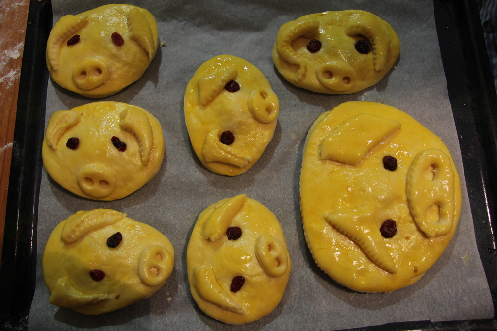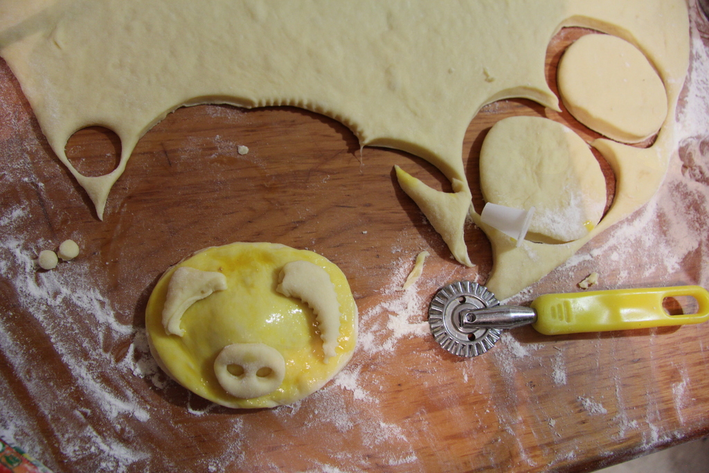Zamesiš bolj gosto testo in ga dobro pregneteš. Vzhajanega razvaljaš od ½ do 1 cm na debelo (za večje prašičke je lahko debelejše). Z obodcem za krofe izrežeš enako velike kroge. Testo, ki ostane od izrezanih krogov, porabiš za nos in ušesa. Nos izrežeš s tulcem premera 2–3 cm (uporabiš lahko prazno embalažo od vitaminskih bombonov). S še manjšim tulčkom premera 1 cm na nosu izrežeš dve nosnici (uporabiš lahko gladek nastavek za krasitev tort ali kaj podobnega). Prvi krog po površini namažeš s stepenim jajcem približno 2 cm naokoli, na nenamazano sredino daš za čajno žličko (več ali manj) nadeva, ki je lahko orehov, makov, skutin, rožičev, marmeladni, čokoladni ali iz čokolina. Pokriješ z drugim krogom enake velikosti. Robove dobro stisneš, lahko jih še enkrat z obodcem obrežeš, ni pa nujno. Vrhnjo plast v celoti premažeš s stepenim jajcem, nanjo položiš nos in ušesa. Ušesa so lahko poljubnih oblik; široka in kratka, ozka in podolgovata, ravna ali podvihnjena, kakor pač nanese. Z rozinami narediš oči in tako izdelane pujse položiš v pekač na peki papir, da vzhajajo. Tik preden daš v pečico, še z jajcem premažeš nos in ušesa in jih pečeš približno 10–15 min pri 200–220 stopinj, odvisno od pečice.