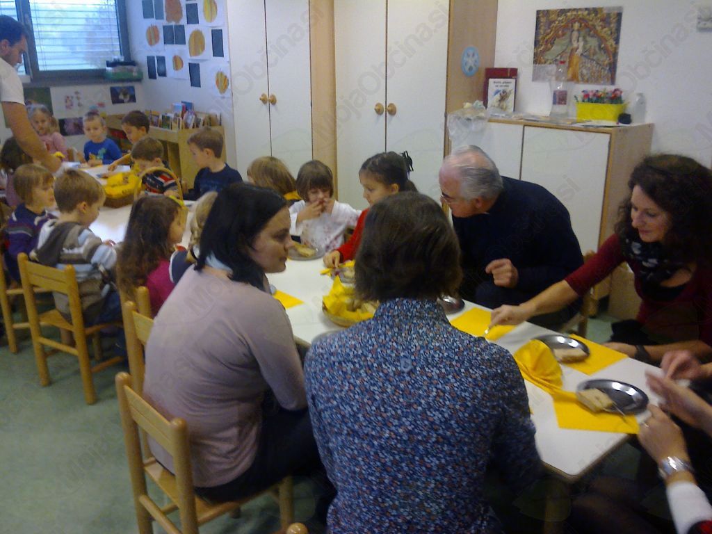 Na zajtrk smo povabili župnika gospoda Pergerja, gospoda župana, gospo Mužar ter gospo Jovan. Z otroki smo jim predstavili prstno igro Panj in čebele in vsi skupaj smo tudi zapeli. Kot je v navadi, je gospod Perger blagoslovil naš zajtrk. Jutro je minilo v zelo prijetnem in sproščenem vzdušju.