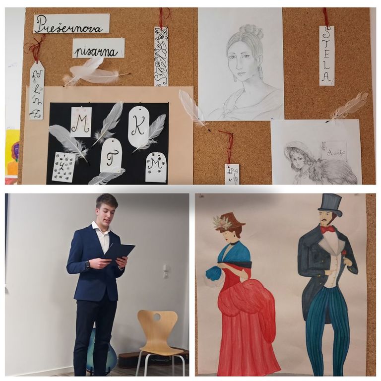 Ob Prešernovem prazniku smo pripravili kulturni dan, poln zanimivih in ustvarjalnih delavnic. Učenci so se prek različnih dejavnosti poglobili v življenje in delo Franceta Prešerna ter slovensko kulturno dediščino. Sodelovali so v delavnicah, kot so ilustriranje Prešernovih pesmi, ustvarjanje plakatov, pisanje sonetov in priprava kratkih gledaliških predstav s tematiko Prešernovih del. Učenci so raziskovali tudi slovenske kulturne simbole, se preizkusili v pisanju z gosjimi peresi in celo posneli kratke videe, kot bi jih objavljal Prešeren na družbenih omrežjih. Kulturni dan je bil pravi praznik ustvarjalnosti, ki je učencem omogočil, da na zabaven način spoznajo bogato slovensko kulturno dediščino.