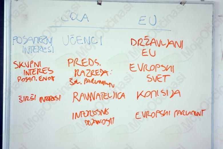 V 6. b-razredu so učenci izvedli simulacijo odločanja Sveta EU in Evropskega parlamenta. Gostujoči učitelj asist. dr. Marko Lovec jim je pomagal razumeti delovanje institucij v predstavniškem političnem sistemu EU s pomočjo primerjave s šolskim predstavniškim sistemom (predsednik razreda, šolski parlament, ravnateljica, učitelji). Odločati so se morali o tem, katero sladico bi si razred privoščil na končnem izletu. Tako so nekateri učenci dobili vloge ministrov držav članic EU, ki so ob pomoči predloženih receptov predstavili nacionalne sladice: italijanski tiramisu, belgijske vaflje, avstrijsko torto Sacher in slovensko prekmursko gibanico. Drugi učenci so predstavljali evroposlance, ki so večinsko odločali o najboljši predstavitvi sladice. Po izglasovani odločitvi za tiramisu so učenci uspešno skupno delo nagradili z velikim aplavzom. Za utrjevanje znanja so dobili domačo nalogo – popraviti slovnične napake v besedilu o institucijah EU, v kateri se lahko preizkusite tudi sami (fotografija). Izvedena učna ura je združila kurikularne cilje dveh predmetov: slovenskega jezika in spoznavanja družbe.