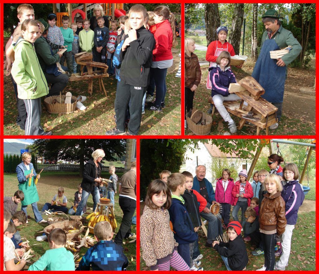 V parku pri šoli smo z učenci ličkali koruzo, jo zvezali, pletli košare, ter opazovali kako mojster naredi čisto taprave cokle. Zelo radi so jih obuli ter poskusili hoditi v njih, kar pa je bilo zelo težko in zelo smešno. G. Pačniku, g. Podpečanu in ge. Kranjc hvala za njihov čas in dobro voljo, pokazali so nam domača opravila, ki jih vedno bolj izpodriva sodobna tehnologija.