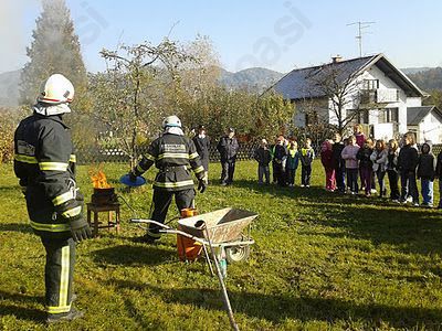 V mesecu oktobru, mesecu požarne varnosti, smo bili z učenci povabljeni v naš gasilski dom, kjer so nam člani društva najprej predstavili svoja oblačila, ki jih imajo za posebne priložnosti oz. pri gašenju požarov, nato pa smo si lahko na sosednjem travniku ogledali praktični prikaz, kako nam lahko zagori olje v kuhinji ter pri tem dobili koristne napotke, kako v takšnih trenutkih pravilno, hitro in učinkovito ukrepati.