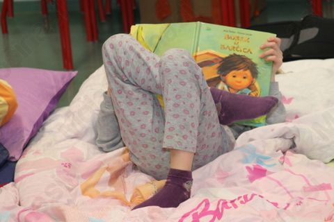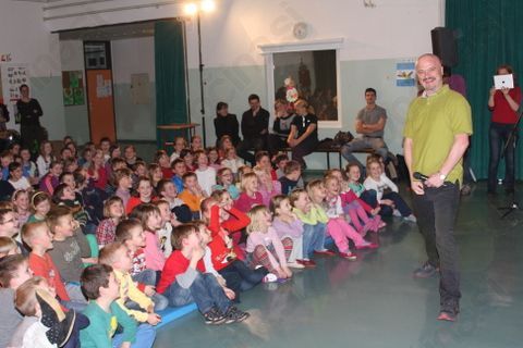 V petek, 12. 4. 2013, smo ob 17.30 odprli vrata za zaključek projekta našim najmlajšim pridnim bralcem. Z bralno kazalko, velikimi kovčki in v spremstvu staršev so nasmejani obrazi iskali svojo učilnico. Po razporeditvi v učilnice se je zbralo vseh 125 učencev v skupnem prostoru in se z uvodnim pozdravom pripravilo na gosta Primoža Suhodolčana, ki nas je s svojim hudomušnim pripovedovanjem nasmejal do solz. Po eni uri nepozabne zabave s pisateljem smo se razdelili v dve skupini. Ena skupina je ustvarjala v likovni delavnici, kjer so otroci izdelali lutko žogico Nogico, druga skupina pa si je po odlični večerji medtem pridobila novih moči. Nato sta se skupini zamenjali. Po druženju z vrstniki in aktualnih družabnih igrah so se učenci pripravili na spanje, nato pa prisluhnili izbranim pravljicam učiteljem spremljevalcem. Prozne besede so jih zazibale v trden spanec do jutra. Ponoči smo s pomočjo fotografij ustvarili kratko predstavitev utrinkov petkovega večera. Tudi najbolj vztrajni učitelji so si privoščili kratek spanec do sedme ure, ko nas je glasba priklicala iz učilnic in že smo zaplesali v sobotnem poskočnem jutranjem ritmu. Zajtrk nam je potešil lakoto, pospravili smo stvari v kovčke, jih odnesli na označena mesta in toplo sonce nas je pospremilo v Kulturni dom Vojnik, kjer so nam učenci 5. razreda, Orffova skupina in mentorji Polona Ahtik, Jure Štokovnik in Emilija Kladnik Sorčan pripravili glasbeno pravljico Žogica Nogica. V kulturnem domu so se nam pridružili še starši.