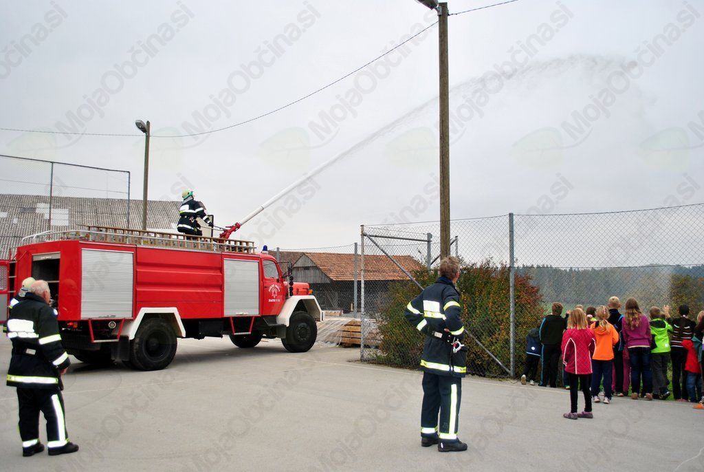 Gasilci so nam prikazali, kako se gasi s topom, in na srečo smo namesto ognja zalivali bližnjo zelenico. Učenci so z zanimanjem opazovali dogajanje, na koncu pa so seveda gasilce lahko tudi kaj povprašali.