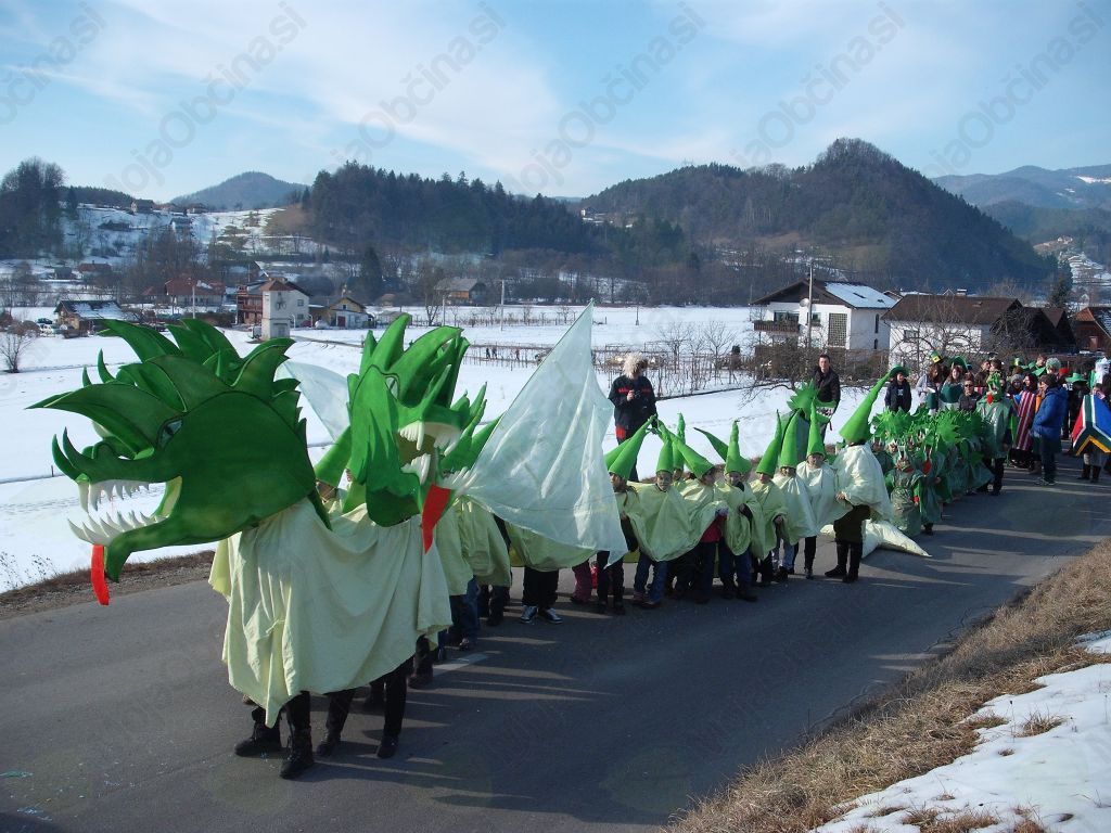 Na pustnem karnevalu v Novi Cerkvi so naši otroci predstavljali masko Soškega zmaja, ki med ljudi prinaša srečo.
