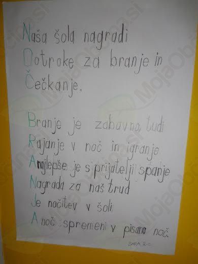 S projektom Noč branja želimo motivirati učence in razvijati bralno pismenost v tej smeri, da bodo naši učenci kvalitetno preživljali prosti čas. Projekt izvajamo na naši šoli že sedmo leto. V tem času smo razvili več razvojnih faz, pri čemer je pomembno vlogo tudi v smislu podpore dala ravnateljica OŠ Vojnik ga. Majda Rojc.