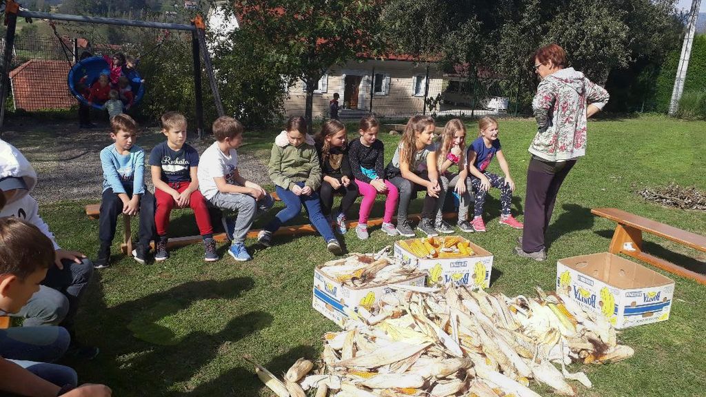 Tako smo povabili člane in članice Turističnega društva Nova Cerkev, ki so z nami obujali star slovenski običaj – ličkanje. Najprej smo s skupnimi močmi na šolskem travniku »kožuhali« koruzo, potem pa so nam prikazali, kako jo zavežejo tudi na kozolček, ki so ga v ta namen pripeljali zraven. Prihodnji teden bomo druženje nadaljevali s pohodom po vaseh KS Nova Cerkev in ga zaključili na kostanjevem pikniku.