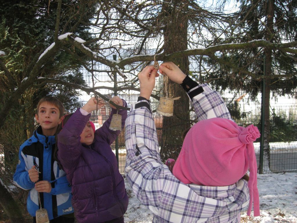 Tudi loj je priporočljiva hrana za ptice, zato smo izdelali lojne pogače in jih obesili na drevo.