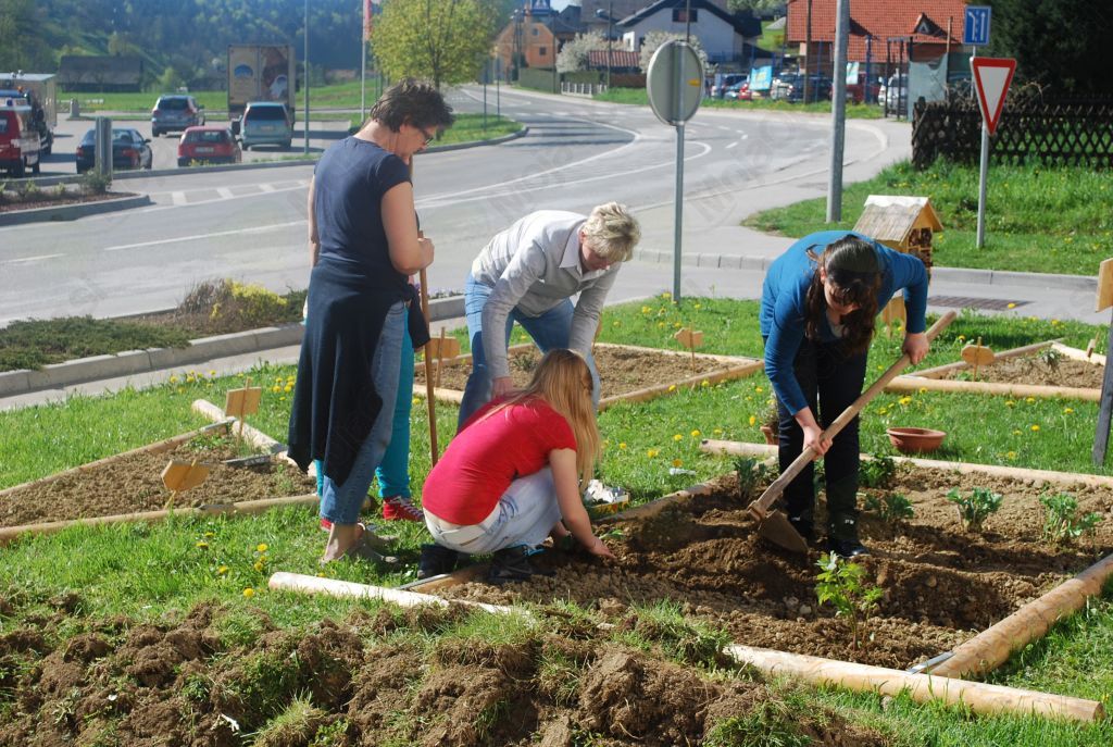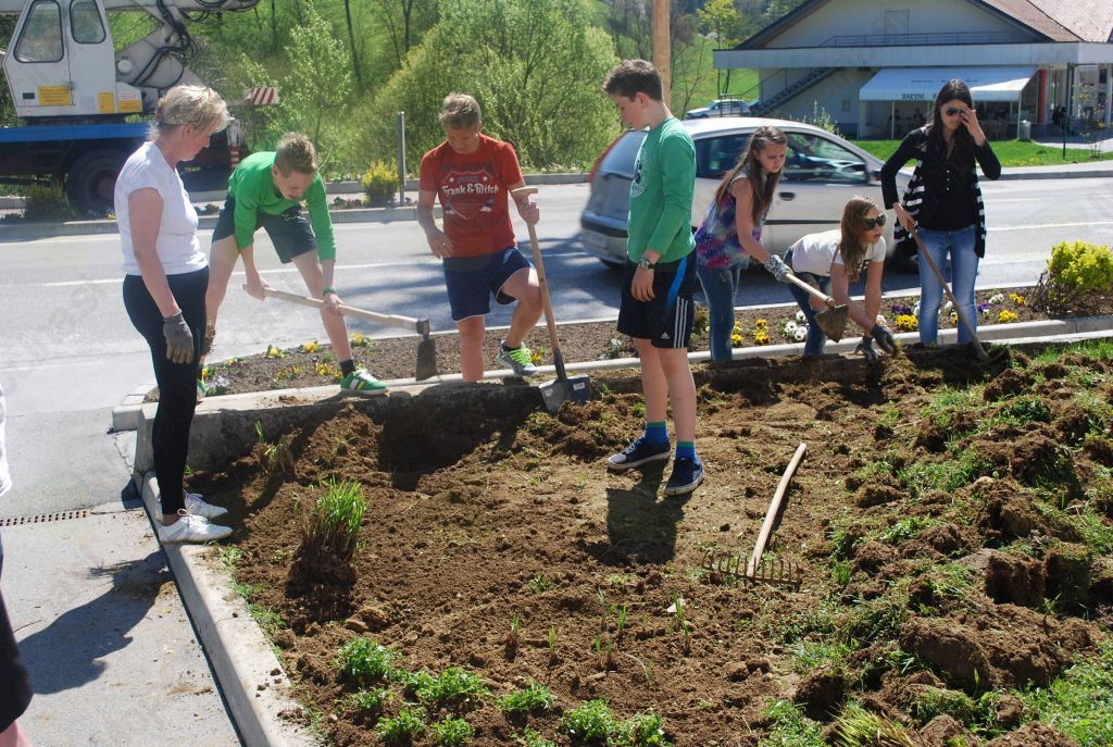 Učenci 8. in 9. razreda so pod mentorstvom gospe Marine Vešligaj  in ob pomoči gospe Milice Vetrih oblikovali gredice in zasajali nanje rože ter zelišča. Vsi sodelujoči pri projektu si zaslužijo izredno pohvalo. Prav posebej pa se zahvaljujemo gospe Milici, ki je nesebično prispevala veliko sadik iz svojega domačega vrta.