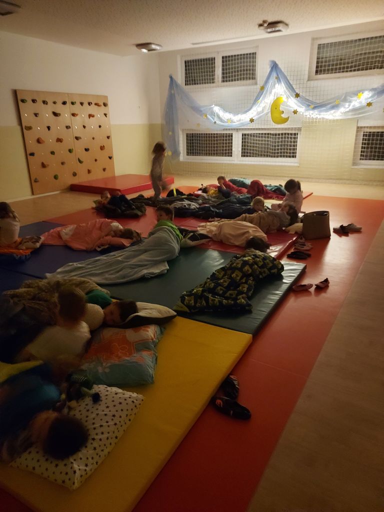 Na enoti Frankolovo smo si aktivnosti začrtali malce drugače. V nestrpnem pričakovanju čarobne noči smo se v četrtek prav tako v poznem popoldnevu zbrali v vrtcu, kjer so otroci najprej dobili lunice kot priponke. Nato smo se odpravili na sladoled in se sprehodili po kraju. Ob vrnitvi nazaj v vrtec smo si pripravili kino z ogledom otroškega filma »Pika nogavička«. V kinu ne smejo manjkati kokice, zato smo si jih spekli. Sledila je večerja s palačinkami in različnimi namazi. Nato smo se hitro oblekli v pižame, pripravili v telovadnici veliko plesišče z lučkami za pižama party. Plesali smo, prepevali, se šli karaoke in nepopisno uživali. Spanec nam je že vztrajno lezel na oči, zato smo precej utrujeni počasi zlezli v spalne vreče na blazinah. Čarobna pravljica je otroke ponesla v sladki spanec. Noč je bila mirna, polna doživetij, ki so se morda nadaljevala še v sanjah …