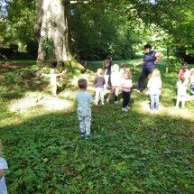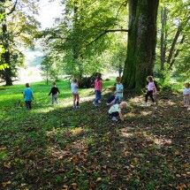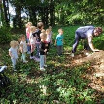 V gozdu smo raziskovali drobne živali (opazovanje mravljišča in vonjanje mravljične kisline), spoznavali drevesa (opazovanje in dotikanje lubja), primerjali liste, gozdne plodove, ustvarjali mandale, hiške ...
