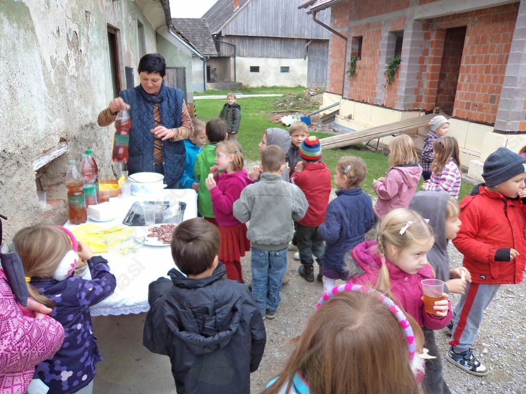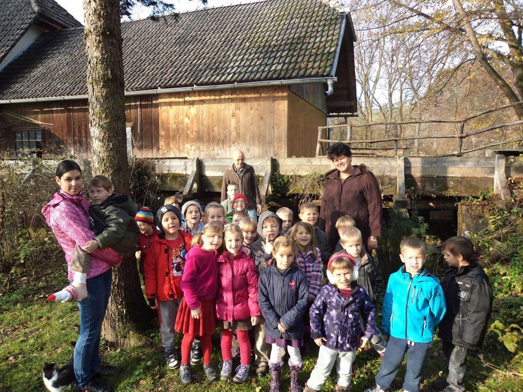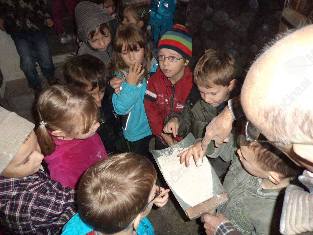 V okviru projekta "V babičini kuhinji" smo obiskali domačijo, ki se zliva z naravo in je kot droben kamenček naravnega mozaika. To je Samčeva domačija, ki ohranja dediščino svojih prednikov. Pričakal nas je prijazen gospod Oton, ki nam je razkazal prelepo naravo, katero obogatijo živalce, ki kar čakajo na nežno otroško dlan. Ogledali smo si žago, najbolj pa nas je pritegnil mlin, ki nam je nudil toliko doživetij. Prisluhnili smo žuborenju vode, vsak otrok pa je stresel prgišče zrnja v mlinske kamne in sledili smo mletju ter pričakali moko ob škafu. Občutili smo drobne delčke moke, ki so nas ščegetali po noskih.