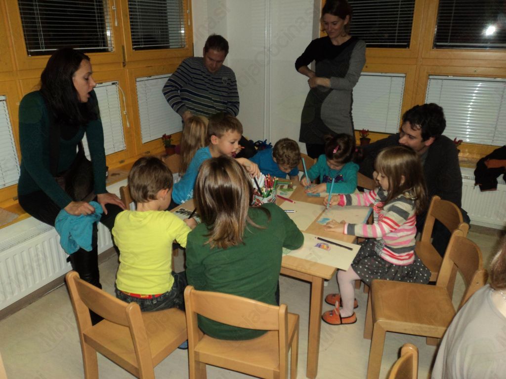 Pozno jesenski četrtkov popoldan smo se zbrali v naši igralnici pri pravljični urici. Starši so pripeljali svoje otroke in želeli tudi oni poslušati pravljico. Seveda so bili dobrodošli. Povedala sem pravljico Miška in mesec. Vzdušje so popestrile tudi prižgane sveče. Po pravljici smo še nekaj časa ustvarjali, risali, rezali in oblikovali iz slanega testa. Ob igri, pogovoru in druženju smo se imeli lepo!
