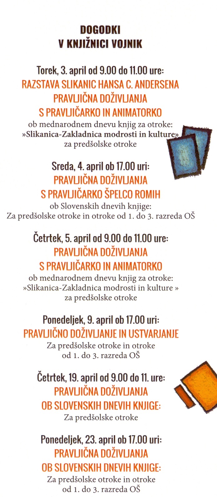 April je mesec knjige, zato ga tudi v Knjižnici Vojnik praznujemo s svojimi mladimi bralci. Oglejte si dogodke (v priponki), ki smo jih pripravili za vas, in pridite k nam.