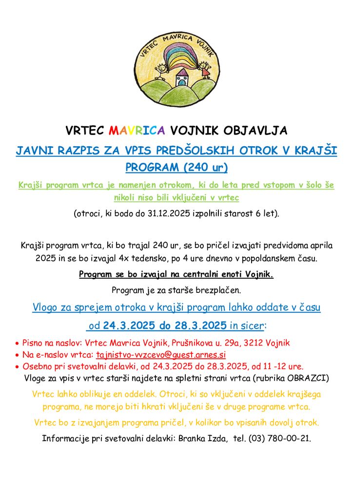 VRTEC MAVRICA VOJNIK OBJAVLJA JAVNI RAZPIS ZA VPIS PREDŠOLSKIH OTROK V KRAJŠI PROGRAM (240 ur)