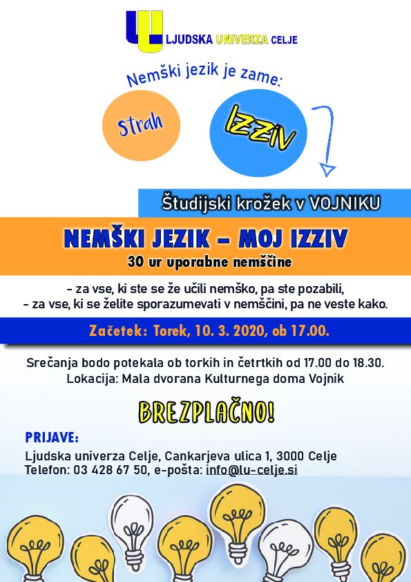 Prihodnji torek, 10. 3. 2020,  se bo v okviru Študijskega krožka v Vojniku pričel 30 urni brezplačni tečaj nemškega jezika, kjer bomo poskušali obnoviti  in nadgraditi vaše znanje nemškega jezika. Tečaj bo zelo situacijsko naravnan, kar pomeni, da se boste poleg nujnih vsebin naučili tiste besede, fraze in izraze, ki jih potrebujete v vaših vsakdanjih življenjskih situacijah …