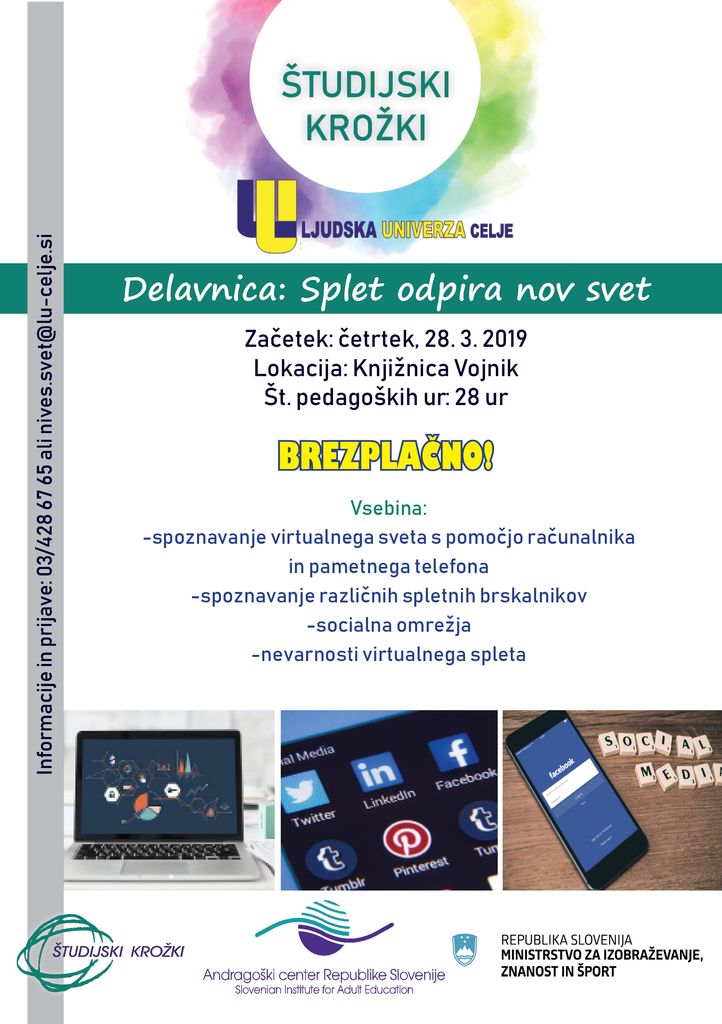 Ljudska univerza Celje (v nadaljevanju LU Celje) v sodelovanju z Andragoškim centrom Slovenije tudi v letošnjem letu BREZPLAČNO izvaja študijske krožke (v nadaljevanju ŠK), ki so sofinancirani s strani Ministrstva za izobraževanje, znanost in šport. V občini Vojnik bo LU Celje, 28. 3. 2019 od 10.00-12.00 ure, pričela z izvajanjem ŠK z naslovom Splet odpira nov svet. Krožek bo potekal v knjižnici Vojnik, Prušnikova 5, Vojnik.