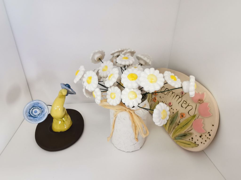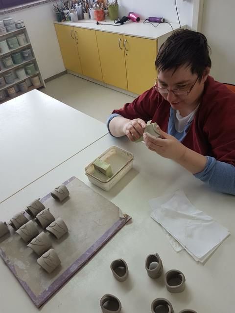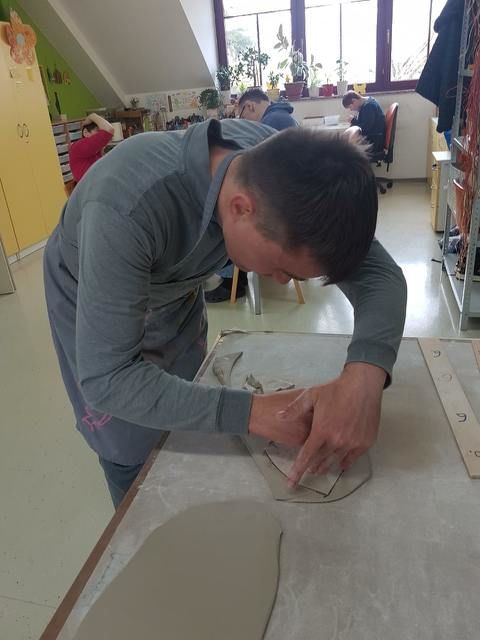 Zlatko: »V keramični delavnici mi je zelo všeč, izdelujemo glinene ptičke, posode, izparilnike, nakit, vaze, hiške … Učim se različnih tehnik dela z glino. Glino zgnetemo, nato jo zvaljamo, z modelčki odtisnemo obliko. Nato se z mokro krpo obrišejo robovi, da niso tako ostri in se ne krušijo, dodamo okraske ali jih izrišemo. Ko je izdelkov dovolj, jih vstavimo v posebno peč za keramiko, kjer se opečejo. Ohlajene nato pobarvamo z različnimi barvnimi glazurami. Za nekatere izdelke imamo mavčne kalupe, v katerih enakomerno porazdelimo glino in jo oblikujemo v želen izdelek.«