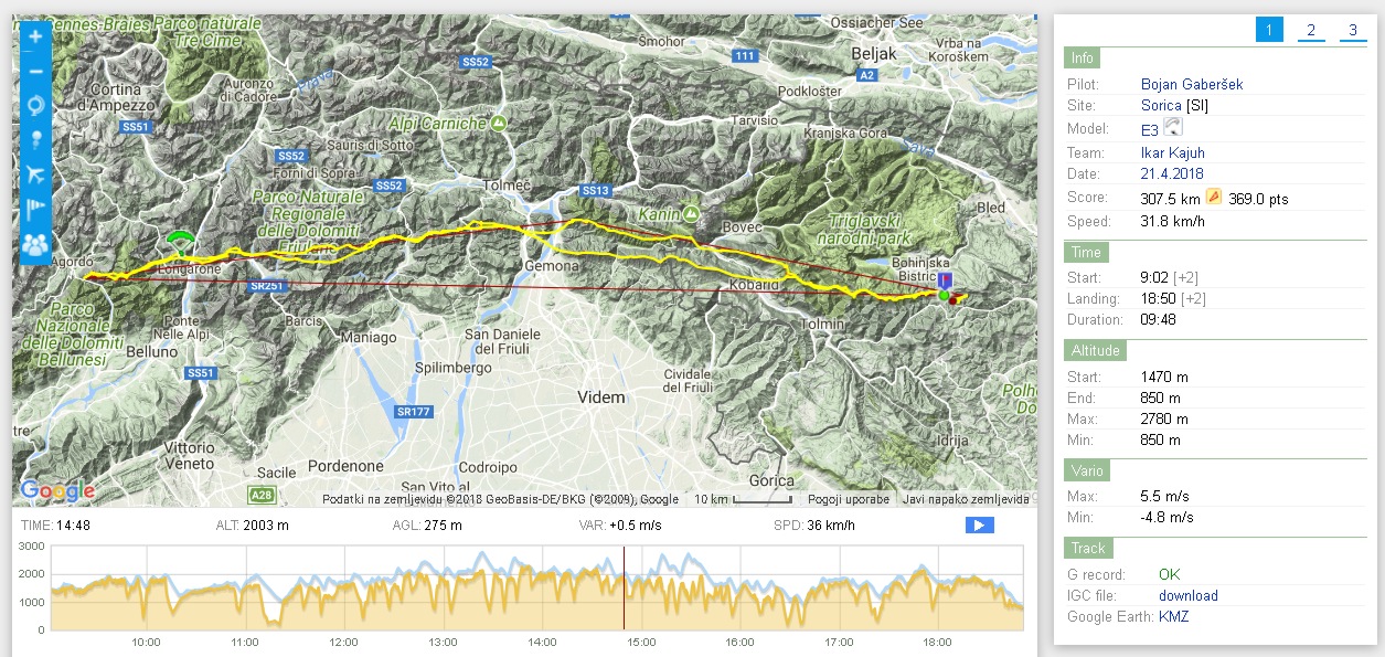 Iz vzletišča Sorica nad Škofjo Loko so odleteli v italijanske Dolomite in pristali nazaj v Sorici po več kot 10. urah letenja. Njihov polet meri 302.11 km in je za več kot 20 km daljši od starega rekorda Italijana Arduina Persella iz leta 2012. Jošt Napret, ki je bil glavni organizator letenja, je osvojil še hitrostni rekord, saj je razdaljo 300 km prevozil s povprečno hitrostjo 32,11 km/h.