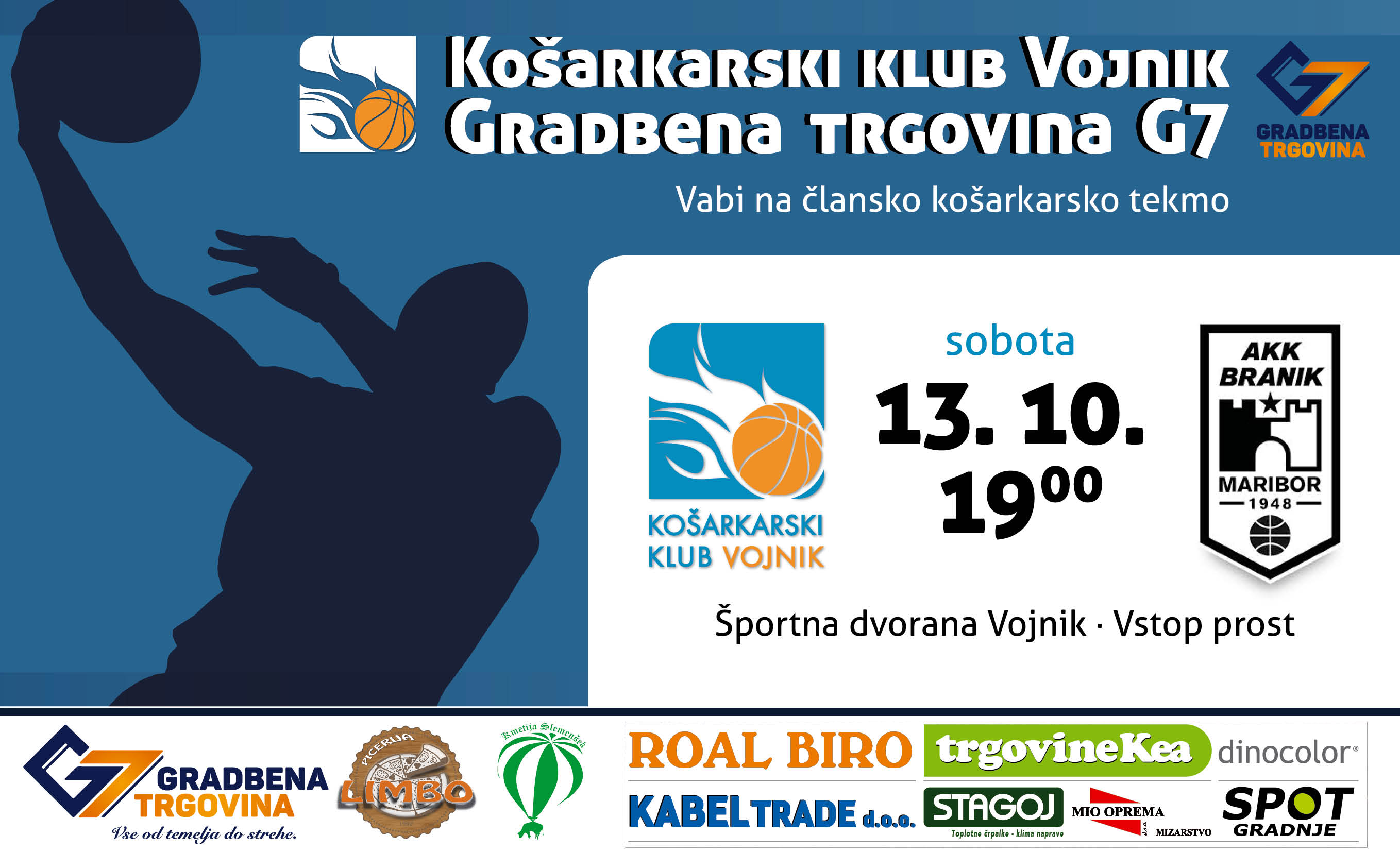 Vabljeni 13. oktobra 2018 ob 19.00 v Športno dvorano Vojnik na tekmo med KK Vojnik Gradbena trgovina G7 in AKK Branik Maribor.