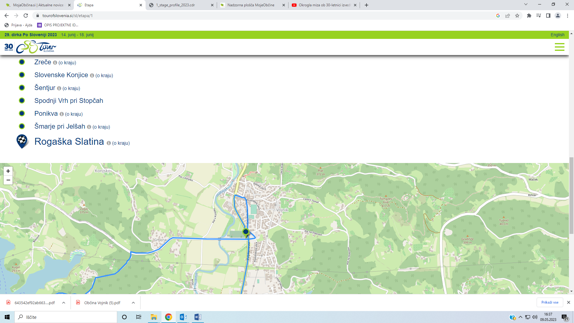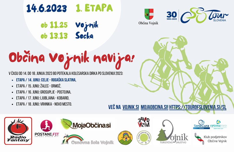 Start 1. etape je 14. junija v Celju in konec v Rogaški Slatini. Kar je za nas zelo pomembno je to, da se bodo kolesarji skozi Vojniku zapeljali po naših ulicah. Start prve izmed petih etap za občino Vojnik pomeni tudi dobro promocijo, saj bomo ta dan navijali, Vojnik pa odeli v prepoznavne barve kolesarske tekme. V naslednjih dneh vas bomo povabili k sodelovanju, in sicer je kar nekaj kotičkov v Vojniku in seveda drugih naseljih, kjer bi lahko postavili zanimive navijaške rekvizite, pobarvana kolesa in pokazali obiskovalcem in tekmovalcem, da smo v občini Vojnik, doma ljudje z veliko športnega duha.
