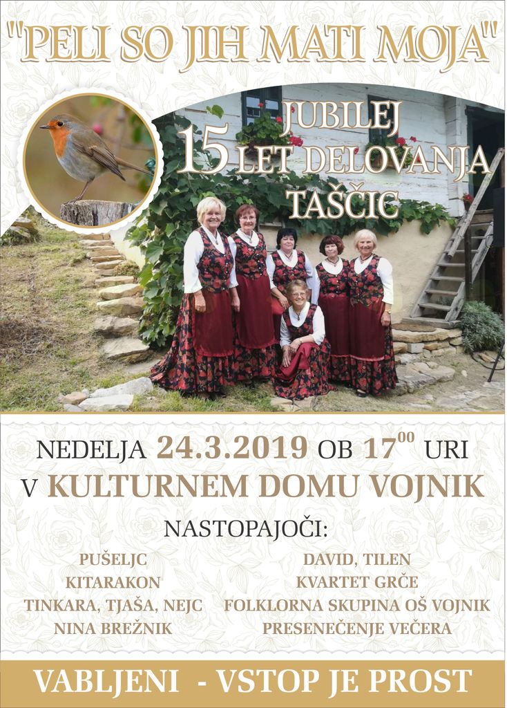 Taščice vas vljudno vabijo na njihov jubilejni koncert ob 15-letnici delovanja, ki bo 24. 3. 2019 v Kulturnem domu Vojnik ob 17.00. Čaka vas tudi presenečenje večera, ki se v bližnji prihodnosti ne bo ponovilo.