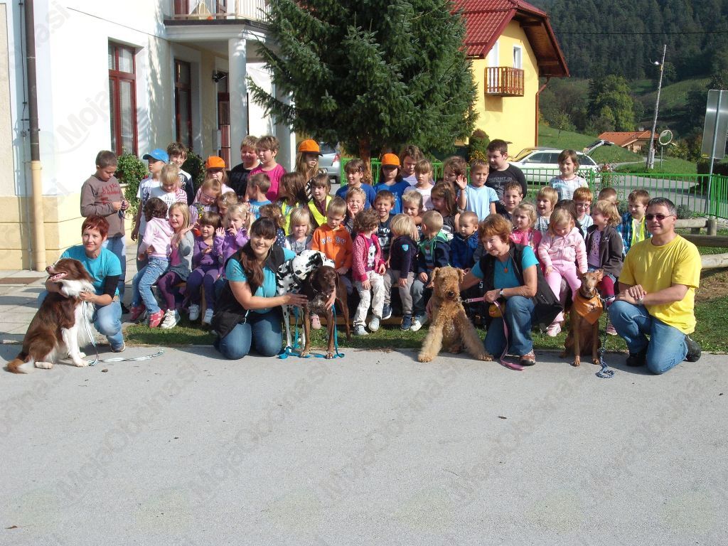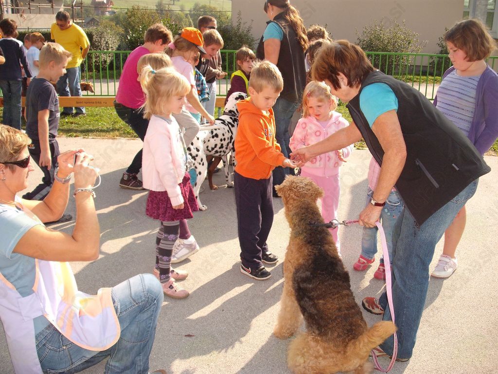 V četrtek nas je čakalo presenečenje. Po malici se je na našem šolske igrišču pojavilo pet kužkov, in to ravno na svetovni dan živali. Obiskali so nas Kosmati smrčki. Kosmati smrčki so skupina za aktivnosti in terapijo s psi. Vsak član Kosmatih smrčkov je v prvi vrsti ljubitelj živali, predvsem psov. Kosmati smrčki z namenom aktivnosti in terapije s psi obiskujejo domove za ostarele, vrtce, šole, tudi šole s prilagojenim programom, centre za varstvo odraslih ipd., skratka vse ustanove, ki si tega želijo in se trudijo kvaliteto življenja svojih varovancev dvigniti na višjo raven. Z nastopi in predavanji izobražujejo ljudi, še posebej otroke in mladino, na kinološkem področju. V Socki smo spoznali kar pet različnih pasem. Kuža Jimm je pasme Cirneco dell’Etna in ima zelo rad sveže kremšnite, kuža Maj je dalmatinec, psička Neli je prišla k svoji lastnici iz zavetišča in je zelo pridna. Spoznali smo še airedalskega terierierja Orsa, ki je potrpežljiv, prijazen in dober čuvaj, in pa kužka Nela, ki je državni prvak v športni kinološki disciplini Rally Obedience. Pokazal nam je kar nekaj veščin, ki jih zares obvlada. Otroci smo mu lahko metali žogo, katero jo je odbijal. Z njim smo se šli pravo malo odbojko. Lastnik posameznega psa nam je povedal značilnosti pasme, kako je potekalo učenje psa, kaj pes rad počne, kaj rad je, koliko gibanja potrebuje … Na koncu smo kužke lahko božali in se z njimi crkljali. Najlepša hvala Kosmatim smrčkom, ker ste nas obiskali in nam polepšali dan.
