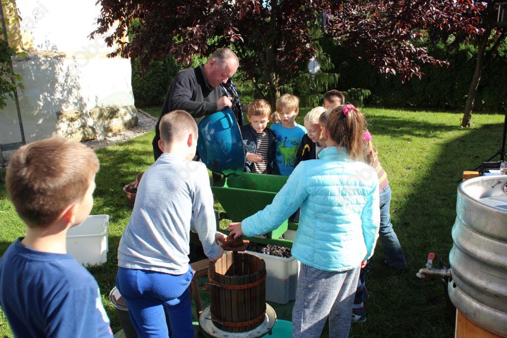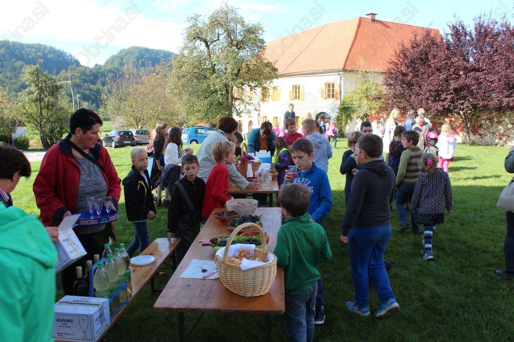 Prireditev se je nadaljevala s stiskanjem grozdja, pri delu so Ediju Tratniku pomagali učenci. Po opravljenem delu smo se vsi okrepčali z dobrotami iz Markove kuhinje, ki so jih ponudili delavci TD Nova Cerkev, in drugimi jesenskimi dobrotami ter seveda s sveže stisnjenim grozdnim sokom.