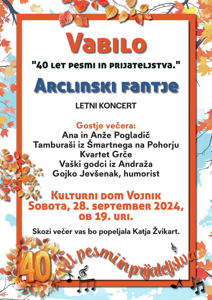 s posebno toplino vas vabimo, da se nam pridružite na prazničnem koncertu ob 40. obletnici delovanja Arclinskih fantov z naslovom "40 let pesmi in prijateljstva", ki bo v soboto, 28. septembra 2024, ob 19. uri v Kulturnem domu Vojnik.