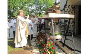 Po slovesnem blagoslovu so žene in dekleta dvignile prvi zvon, ki tehta 230 kg, fantje in možje pa drugega, ki ima 530 kg. Slovesnost je vodil msgr. dr. Stanislav Lipovšek, celjski škof, ki je s to cerkvijo še posebej povezan, saj sta se leta 1941 tu poročila njegova starša. V slovesnem somaševanju so sodelovali še domači župnik Anton Perger, dr. Bogdan Kolar in Franc Brecl. Škof je spregovoril velikemu številu vernikov, ki so prišli iz različnih krajev in napolnili prostor pred cerkvijo. Kot otrok je bil pogosto v tej cerkvi, saj so imeli stari starši pod cerkvijo vinograd. Spominja se: ''Tam so možje okopavali vinograd, se veselili in šalili, a ko se je oglasil zvon, so možje sneli klobuk z glave in zmolili Angelovo češčenje. Jaz sem pa to kot deček gledal pa mi je to ostalo zelo v spominu in me to spremlja. Kakšen zgled je to za otroka? Če smo sedaj opustili to navado, nismo nič bolj bogati, ampak obubožani. Skušajmo to ob novem zvonu na novo odkriti. Zvon je tudi glasnik, če se kdo poslovi od nas. To ni samo glasnik žalostnega dogajanja, ampak vere, upanja in ljubezni … Zvonovi vabijo k bogoslužju, ki je v bistvu srečanje z Jezusom Kristusom … Kristjani moramo biti luč, kvas in sol zemlje. Novi zvonovi so novi klicarji vere, upanja in ljubezni …'' Slovesnost je povzdignilo igranje godbe na pihala iz Nove Cerkve ter petje domačega pevskega zbora pod vodstvom prof. Tomaža Marčiča. Sveta maša je bila namenjena tudi v zahvalo za škofovo sedemdesetletnico življenja. Ob koncu slovesnosti je marsikomu privabilo solze v oči zvonjenje novih zvonov, ki so jih strokovnjaki pritrdili v zvonik in usposobili za ''opravljanje njihove službe''. Po slovesni sveti maši je sledilo srečanje in agape, za katerega so poskrbele pridni gospodarji in gospodinje.