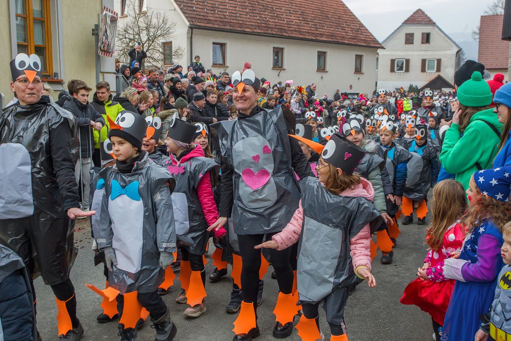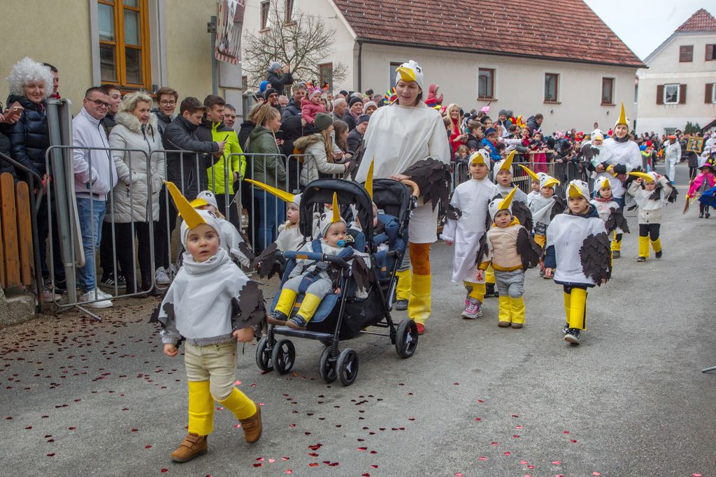 Iz Antarktike je na karneval priteklo 50 pingvinčkov, drugošolcev iz OŠ Vojnik, skupaj z Anko Krajnc, Janjo Belej, Urško Agrež in Maticem Kričejem |