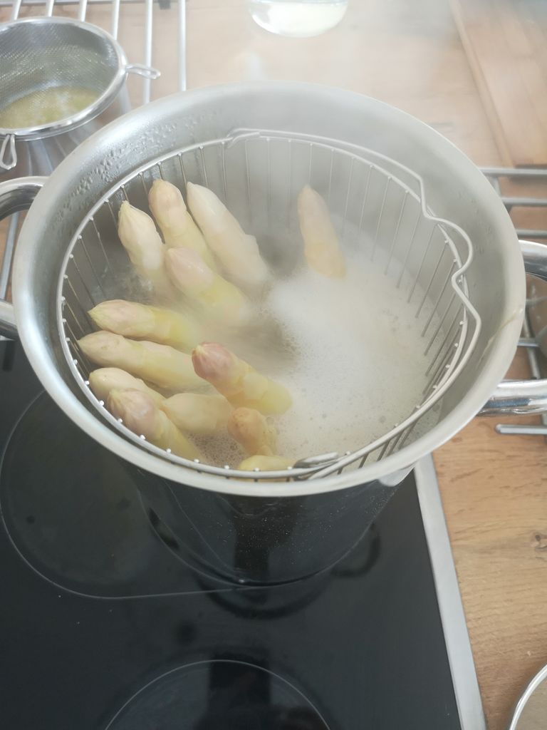 V vino damo polovico čebule, česen, klinčke, muškatni orešček in pehtran ter na zmernem ognju pustimo, da zavre (pribl. 5 min). V tem času se iz vina izloči alkohol. Pripravljeno zmes pustimo, da se ohladi, nato pa jo precedimo. Medtem ko čakamo, da se vino ohladi, stopimo maslo, ločimo rumenjake od beljakov ter jih po želji/okusu solimo in popramo. Olupimo bele šparglje in jih damo kuhati. V vodo dodamo limono, 1 žlico masla in sol. Šparglje kuhamo 4–5 min, odvisno od njihove debeline.