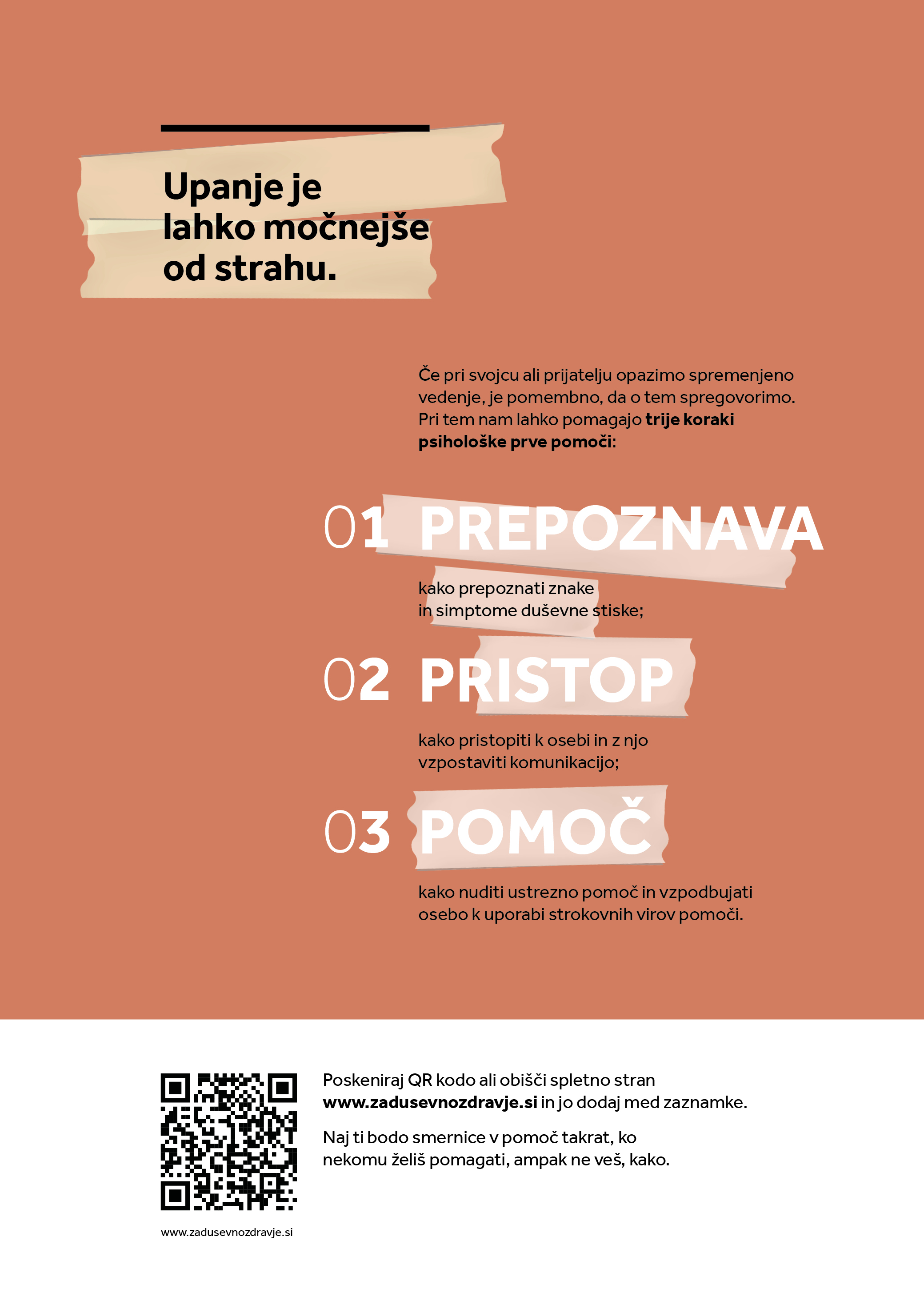 Vsak od nas je verjetno že imel, ima ali pa bo kdaj v prihodnje imel bližnji stik z osebo v duševni stiski. To je lahko družinski član, prijatelj/ica, sodelavec/ka, sosed/a,… Kako se bomo odzvali v odnosu z nekom, ki je v stiski, lahko ima pomemben vpliv pri reševanju te stiske ter nadaljnjem iskanju ustrezne pomoči. Ampak kako vemo, katere korake sprejeti, ko se pred nami znajde oseba v stiski?
