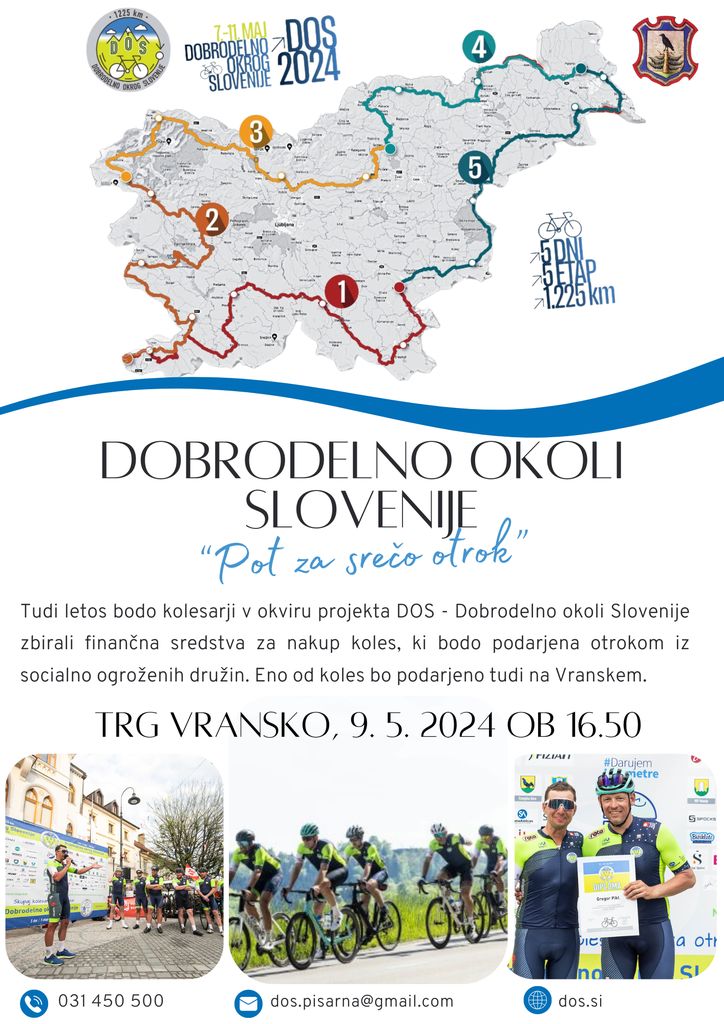 Tudi letos bodo kolesarji v okviru projekta DOS - Dobrodelno okoli Slovenije zbirali finančna sredstva za nakup koles, ki bodo podarjena otrokom iz socialno ogroženih družin. Eno od koles bo podarjeno tudi na Vranskem. Uradni slogan projekta se glasi: “Pot za srečo otrok”.