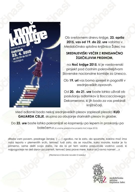 Ob svetovnem dnevu knjige, 23. aprila 2015, vas od 19. do 22. ure vabimo v Medobčinsko splošno knjižnico Žalec na: SREDNJEVEŠKI VEČER Z RENESANČNO ŽGEČKLJIVIM PRIDIHOM, na Noč knjige 2015, ki je vseslovenski projekt pod častnim pokroviteljstvom Slovenske nacionalne komisije za Unesco.