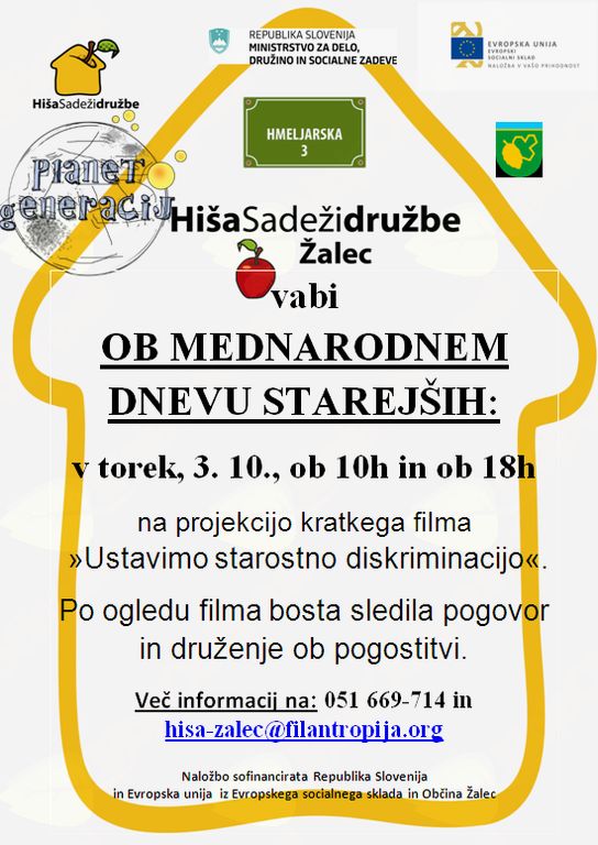 Obiskovalci si bodo lahko ogledali kratki film »Ustavimo starostno diskriminacijo«, s katerim želimo starejšim, ki nas obiskujejo, povedati, da staranje ni nič hudega, temveč naravni proces, ki ga moramo v resnici slaviti. Prav tako želimo opozoriti na starostno diskriminacijo, ki je problem tudi v Sloveniji, ob enem pa starejšim povedati, kako pomembni so za nas vse. Po filmu bo sledil pogovor o videnem in druženje ob pogostitvi.