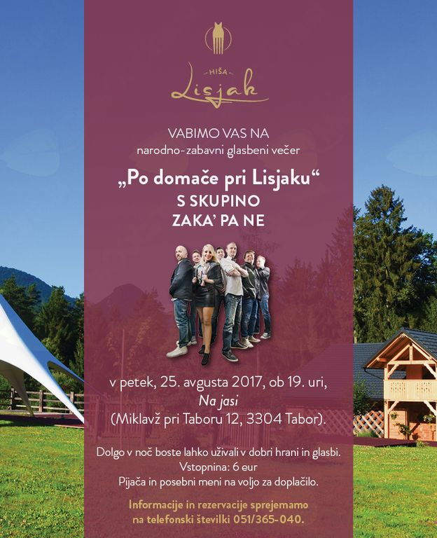 Vabljeni na narodno-zabavni glasbeni večer »Po domače pri Lisjaku« s skupino Zaka’ pa ne, ki bo v petek, 25. 8. 2017, na čudovito prenovljeni lokaciji v Miklavžu pri Taboru - Na jasi.