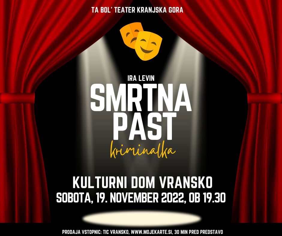 Prizorišče gledališke predstave Smrtna past je delovni kabinet Sidneya Bruhla, pisatelja iz Connecticuta. Dogajanje je postavljeno v 70. leta z vložki iz sedanjosti. Pred očmi gledalca se odvija zgodba z več preobrati in umori, a vendar do konca ne vemo, kdo je morilec in kdo res ubit. Zapletov je več kot dovolj, pisati za gledalce in tudi igralce pa še več ...