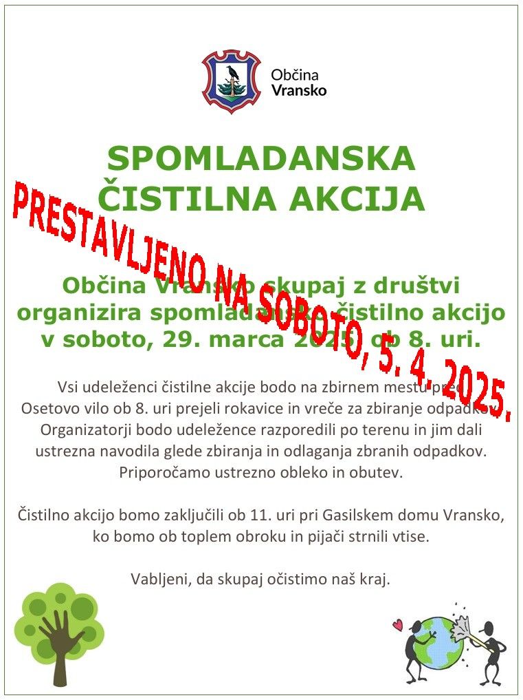 SPOMLADANSKA ČISTILNA AKCIJA JE ZARADI NAPOVEDI SLABEGA VREMENA PRESTAVLJENA NA SOBOTO, 5. 4. 2025.