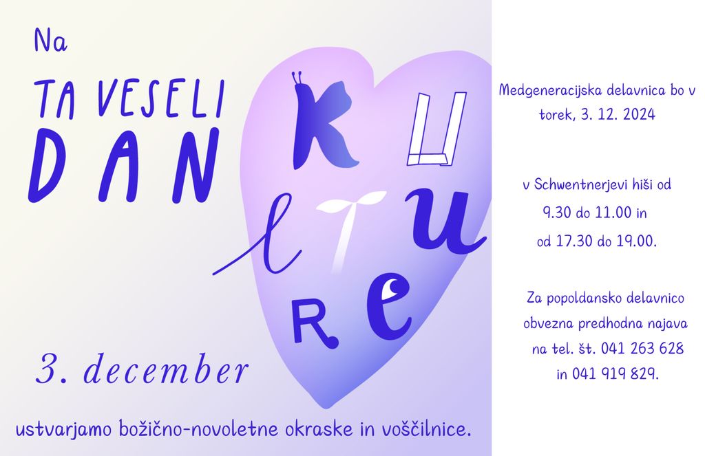 Ob prazničnem času vas vabimo, da se nam pridružite na medgeneracijski delavnici izdelovanja božično-novoletnih okraskov, ki bo potekala v Schwentnerjevi hiši v torek, 3. decembra 2024.