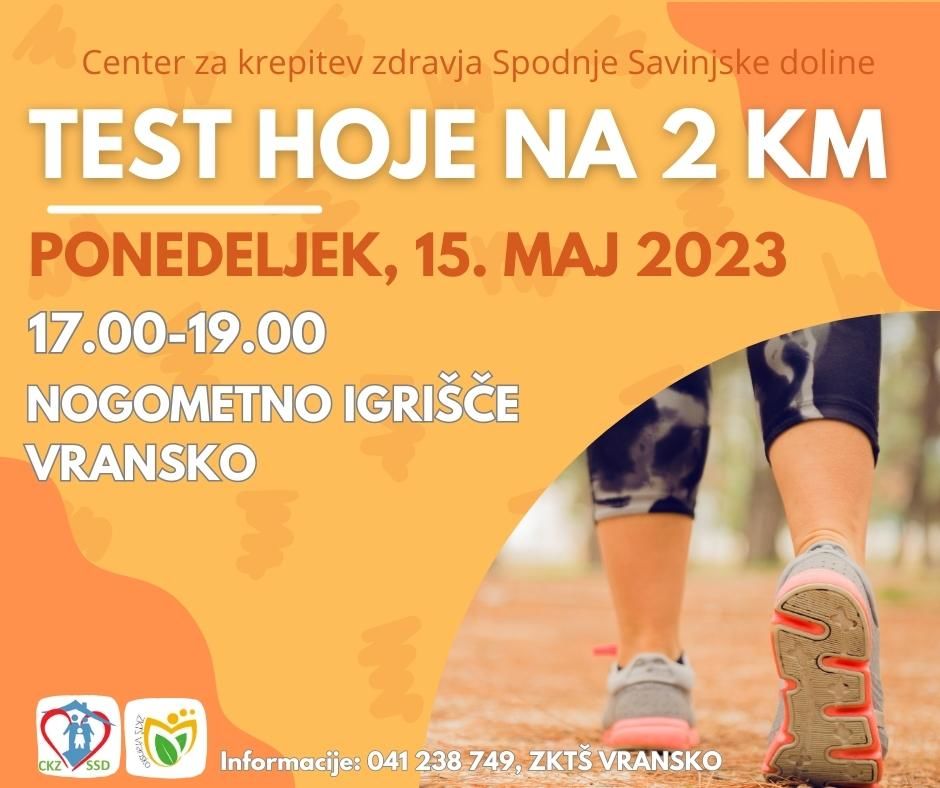 Center za krepitev zdravja Spodnje Savinjske doline bo v ponedeljek, 15. maja 2023, od 17.00 do 19.00 na nogometnem igrišču Vransko izvajal test hoje na 2 km.