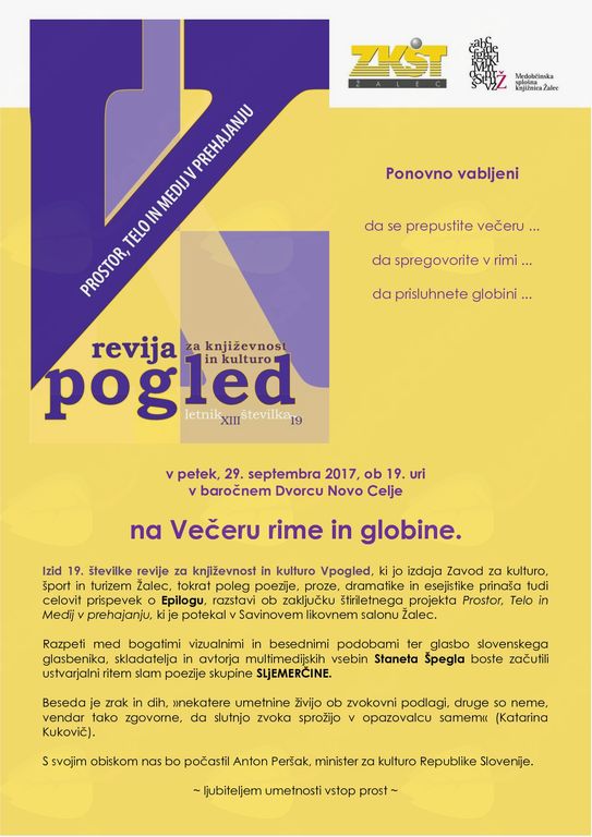 v petek, 29. septembra 2017, ob 19. uri v baročnem Dvorcu Novo Celje na Večeru rime in globine.