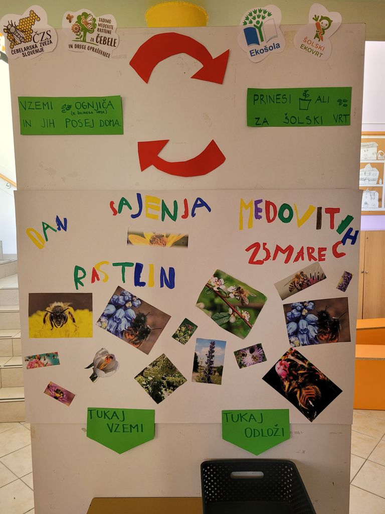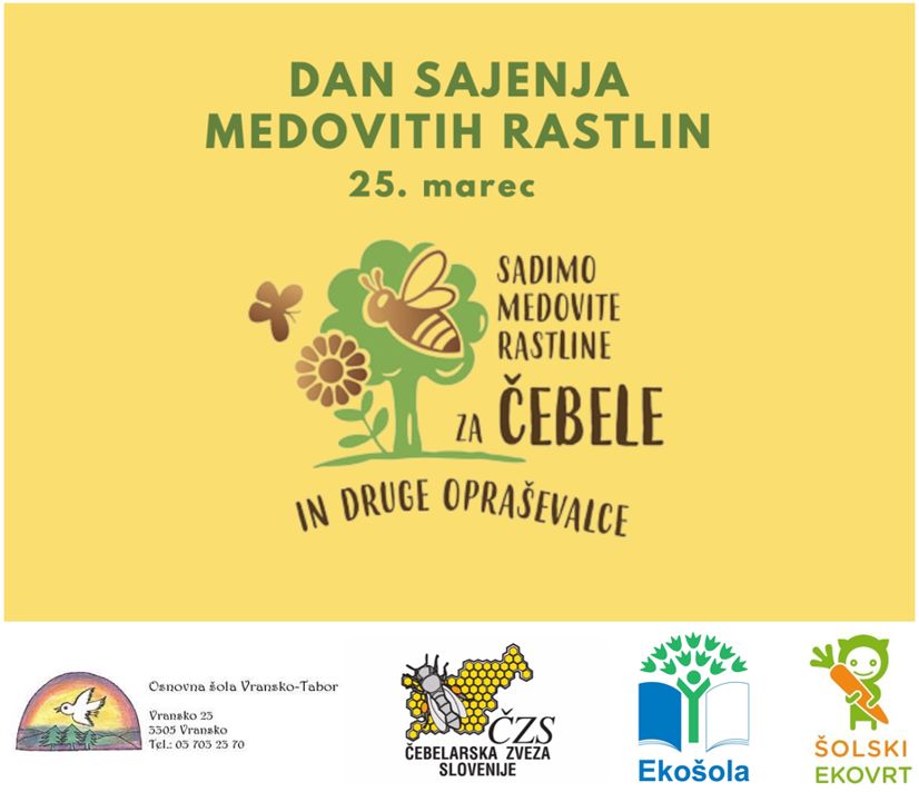Tudi naša šola se je pridružila projektu in v tednu projekta posadila štiri sadike medovitih dreves na šolski vrt in v gozdiček. Sadike je preko razpisa Čebelarske zveze Slovenije priskrbel Ludvik Krajnc iz ČD Vransko, člani čebelarske dejavnosti na šoli pa smo sadike posadili. Naš vrt je sedaj bogatejši za divjo češnjo, divjo jablano, navadno lipo in belo jelko. Hkrati smo na šoli pripravili manjšo izmenjavo semen in sadik. Učenci so lahko domov odnesli domov semena ognjiča, ki smo ga pridelali na šolskem vrtu, prinesli pa so lahko sadike medovitih in drugih rastlin, ki jih bomo ob priložnosti posadili na šolski vrt. Več si lahko ogledate v kratkem videu. Vse učence, starše in občane vabimo, da sadike medovitih dreves in rastlin skupaj posadimo v okolje in pomembno prispevamo k ohranitvi narave, čebel ter ostalih opraševalcev za prihodnje rodove.